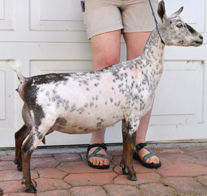Tahiti has the incredible general appearance we have come to expect from Cleveland Sage daughters, along with tons of dairy character, a wonderful escutcheon arch, very good capacity, and texture. We'd like to see her a bit tighter in the toes, and if we were being really picky, a bit sharper in the withers. In 2019, she kidded less than two weeks before our LA session, so was still putting herself back together, though by the time the National Show came around, she definitely was in full bloom, easily rising to the top of her class, and going on to win National Champion and National Best Udder. She has a very sweet disposition, and is so veeeery chill. Nothing surprises her. Well, except for that time that something (probably a racoon) bloodied her up overnight. She was a little shocky for a few days after that, but we were very relieved to see her get back to her old self relatively quickly, and that her production came back by a week or so later.