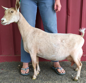 This golden girl came into the world just a week after one of my very favorite does of all time, Lunar Eclipse, went to sleep for the last time, and the name seemed like a good tribute to a doe who made me smile every day. This girl won't go in the holding stall at milking time until I pat her on the head and tell her she's a very pretty girl, which, as quirks in goats go, was a fun little routine, until a bunch of the other does caught on, and now also insist on hearing compliments before walking into the stall as well. She has strong scores in dairyness, a high rear udder, and a nice rounded escutcheon, allowing her to easily move around her udder. She's long bodied with good width and depth for her age, pictured here as a first freshener.