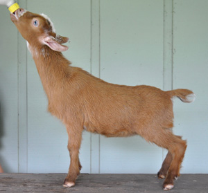 I'm hoping to get a new picture of this doe soon as her red as gotten even deeper since this picture- she's turning out to be that elusive "Kingwood red" ("old timers" will know who I'm talking about- he's back about seven generations in this doe's pedigree) as she matures. The circumstances around her birth weren't great, and she ended up being the only survivor out of a set of quads, and we were concerned we'd lose Moon Beam as well. She's a quietly intense doe, who manages to stand out in the junior pen- possibly because she manages to win the "queen of the mountain" game a majority of the time.