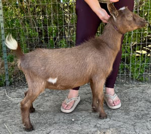 One of our suprise kids from 2019, this moon spotted doe is maturing nicely, showing some of the strengths we were hoping to see come through from Snow Patrol- a clean high escutcheon, strong back, and wide rump.