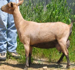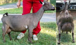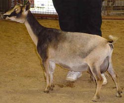 in our herd. She easily earned her MCH as a young doe, and when ADGA opened up a Nigerian herd book, she went out and won her GCH as a six year old. She has beaten the big girls for Best Doe in Show three times, and between AGS and ADGA has seven best udder awards. Not only does she show well, she produces in the milk bucket, earning the top spot for one day milk test in 2003 with 6lbs. of 5.07% butterfat milk. At seven years old, she earned EEEE FS92 on ADGA's Linear Appraisal.