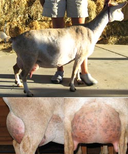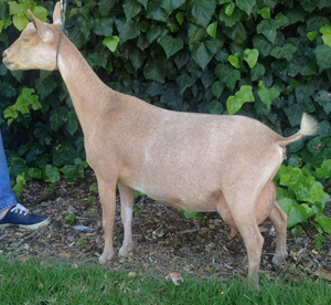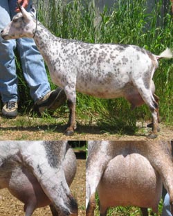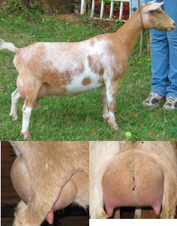 the band) has been a favorite from the beginning. She is a long, elegant doe, with smoothness of blending, straight front legs, a wide rump and lots of dairy character. Her udder is high and wide with a tremendous area of udder attachment and excellent texture that milks down very well. She has this quiet sense