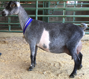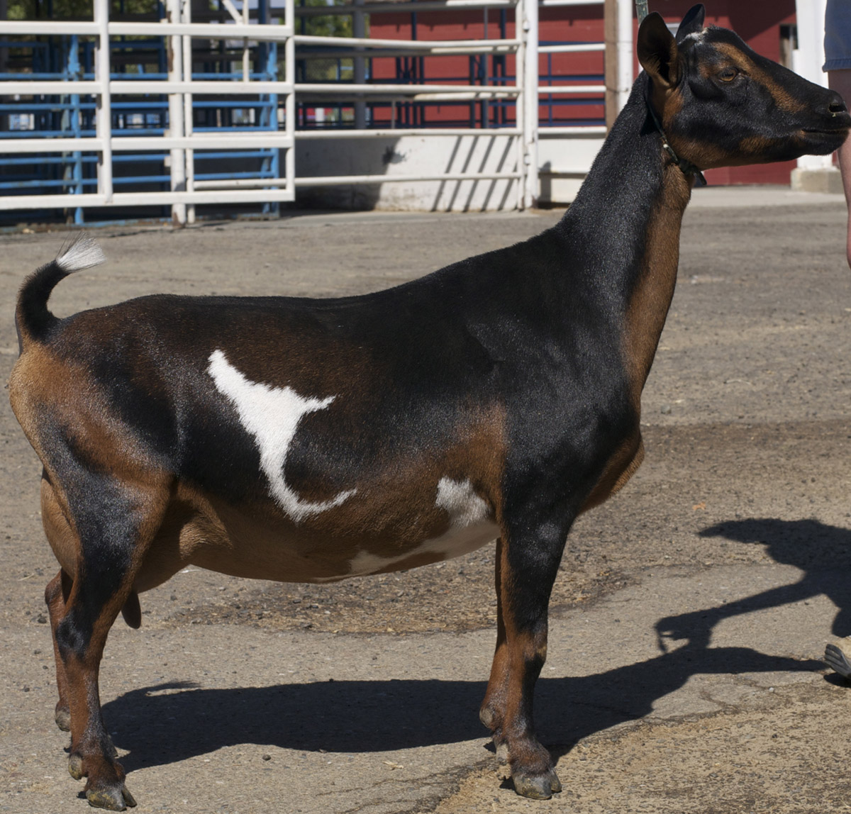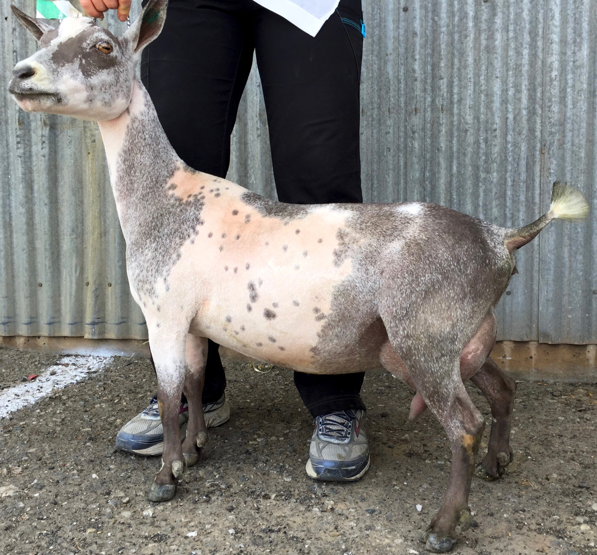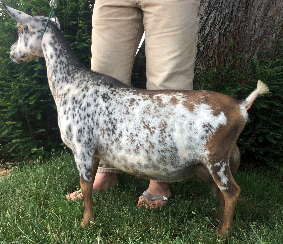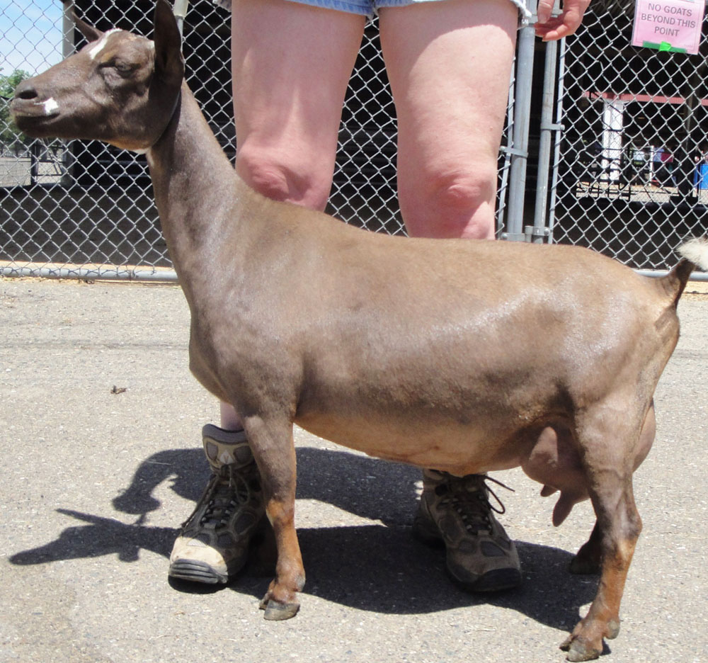 Sire: CRF Castle Rock Guy Noir ++B +S Roxanne is a very long necked, angular, and wide doe with good blending and a smoothly blended front end assembly with a flat topline. Even though still small, she has a tremendous amount of width between her hocks on the move- a trait that runs pretty strongly on the maternal side of her family tree. While she is a long bodied doe, I would like to see a little more width of body when viewed from above. She has soft udder texture, good teat placement and size, a strong foreudder, and is very easy to hand milk. As a five year old, she started to really hitting her stride, winning quite a few champion challenges, and Best Udder awards with an udder that is high, wide, capacious, and well attatched, with a strong MSL, and well placed teats. She continued to do well as a six year old, racking up her 20th Best of Breed award and winning a Best Udder in Show against the big girls. As a seven year old, she made it clear that she was so over this showing thing, and we figured with 21 Best of Breed wins, she has earned the right to relax at home. Update: in 2019, Roxanne freshened for the 10th time and looked so good, I just had to see if she would be okay with showing again, and at two weeks fresh, she picked up two more BOB and best udder wins! Gotta love a doe who holds up that well over time!