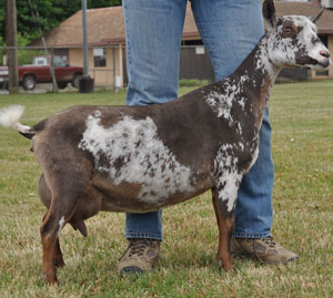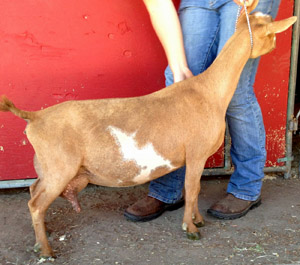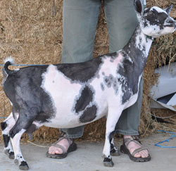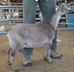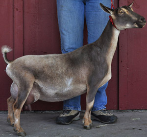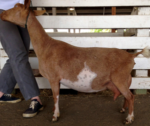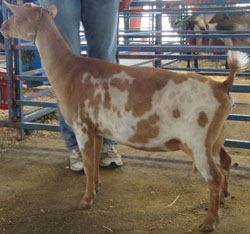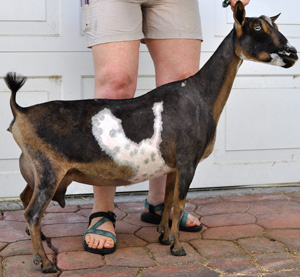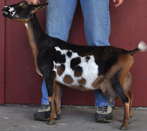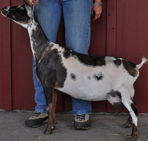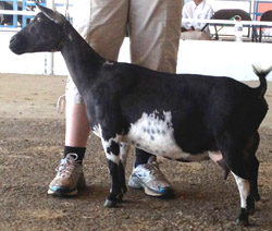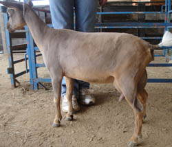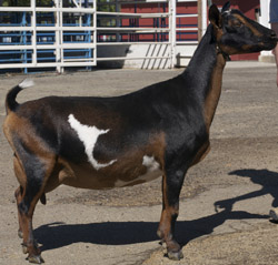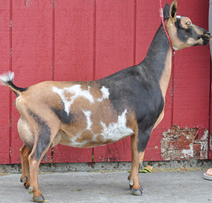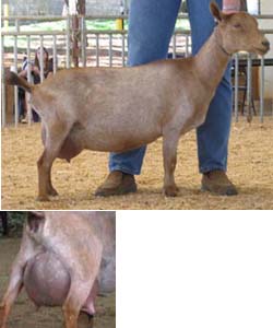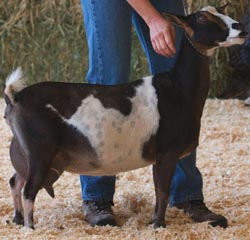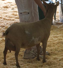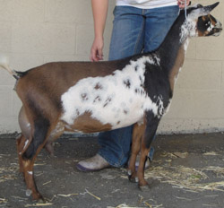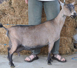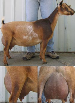 Nice, smoothly blended doe with good brisket extension, a very good front end assembly, depth of body, and a wide rump with well placed thurls. She has a well attached mammary system, with excellent texture and plumb, easy to milk teats. Mahindra is very likely to be right behind or next to me any time I am in the same pasture she is, and is our self-assigned barnyard-project manager. Mahindra is almost always first or second in her class, and has gotten lots of compliments for her general appearance and udder shape and attachments. | |||||||||||||||||||||||||||||||||||