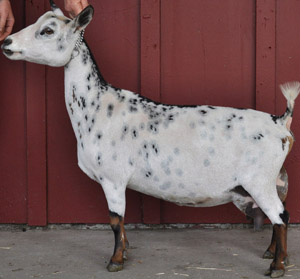 Sire: Twin Creeks BW Rebel w/o a Cause *S Sky has a high escutcheon, a nice front end assembly, is very full in the crops, has length from hips to pins, and good depth of barel. Even though she was dam-raised, she could easily be mistaken for a bottle baby, as she still tries to jump up in my lap- which at her current size is a bit uncomfortable. We are very pleased with her udder- so far, she has accumulated eleven best udder awards over some very tough competition! She has lots of attachment all around, a high rear udder and a smooth foreudder with a strong MSL and nice large plumb teats, and milks down to almost nothing. She has perfect milk stand manners and if, by some strange happenstance, another doe gets to be milked first, Sky will loudly let you know that this is NOT okay, and should not happen again in the near future (if ever). Sky is now retired and keeping watch over the herd as our current queen and settler of disputes amongst does. She has passed on wonderful attributes to daughters SkyRocketGilia, GCH Siren Song, and GCH Ghost Pine.