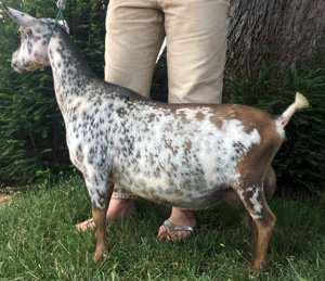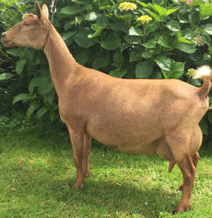 This doe is the product of a repeat breeding that produced our herdsire, Bentley. She has loads of dairyness, straight front legs, and excellent udder texture. Her MSL is strong, and she has easy to milk teats, a strong foreudder, and a lovely rear udder arch. Karmann has a nice level topline, smoothness of blending and angularity with a very feminine face.