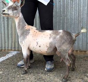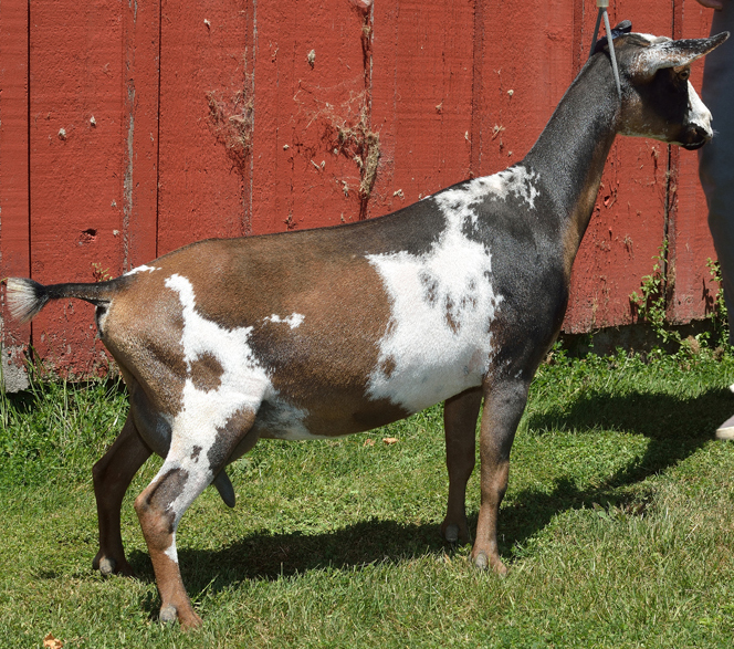 Lula is a very stretchy, elegant, dairy doe who stands on a strong set of feet and legs. She walks with lots of width between her hocks, has good spring of rib and her soft pliable skin makes it very easy to feel how widely spaced they are. Her udder is wide and capacious with a strong MSL, though her foreudder could be a bit more smoothly blended. I really like her general appearance and dairy character, and she has finished her championship against some very large, competitive classes of does. DHIA: