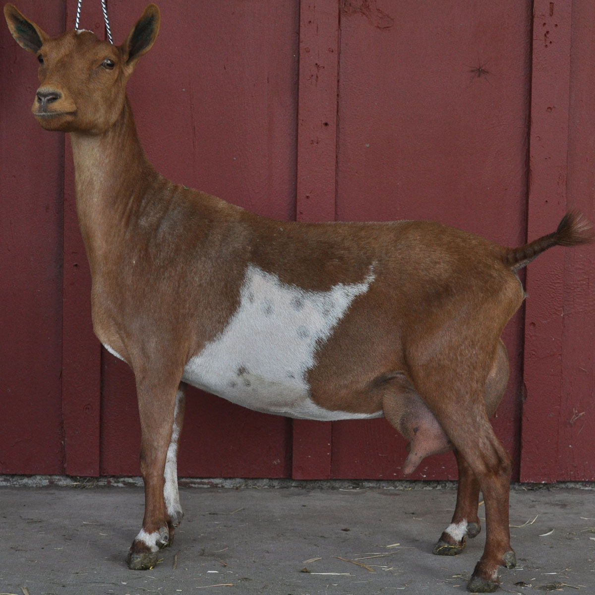 There are so many things I appreciate about this doe- she has wonderful dairy character, a wide rump from thurl to thurl, a really good front end, and a well attached udder that is high and wide when viewed from behind. While she is named Sun Maid, after a rose, her color makes me think more of the brand of raisins, which led me to calling her Raisin, which somehow morphed into Rey. Though she has done quite a bit of walking on her back legs and hopping around the show ring, if she manages to stay on all four feet, she shows off how lovely she is and winds up near or at the head of her class. Her second freshening udder is lovely, and she seems to have stretched out even more this year. According to Linear Appraisal, she has an excellent head, back, rump, and udder texture, and I can't argue with any of that. I'm very pleased with how she is maturing and her quiet, sweet personality. We lost Sunmaid far too early, but have her son, Castle Rock Rainbow Sunblaze, to hopefully continue her legacy in the herd. | |||||||||||||||||||||||||||||||||||